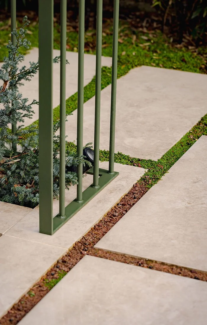 Detail of stone paving slabs with lush green ground cover between joints and a modern green railing, part of a professionally constructed garden in London.