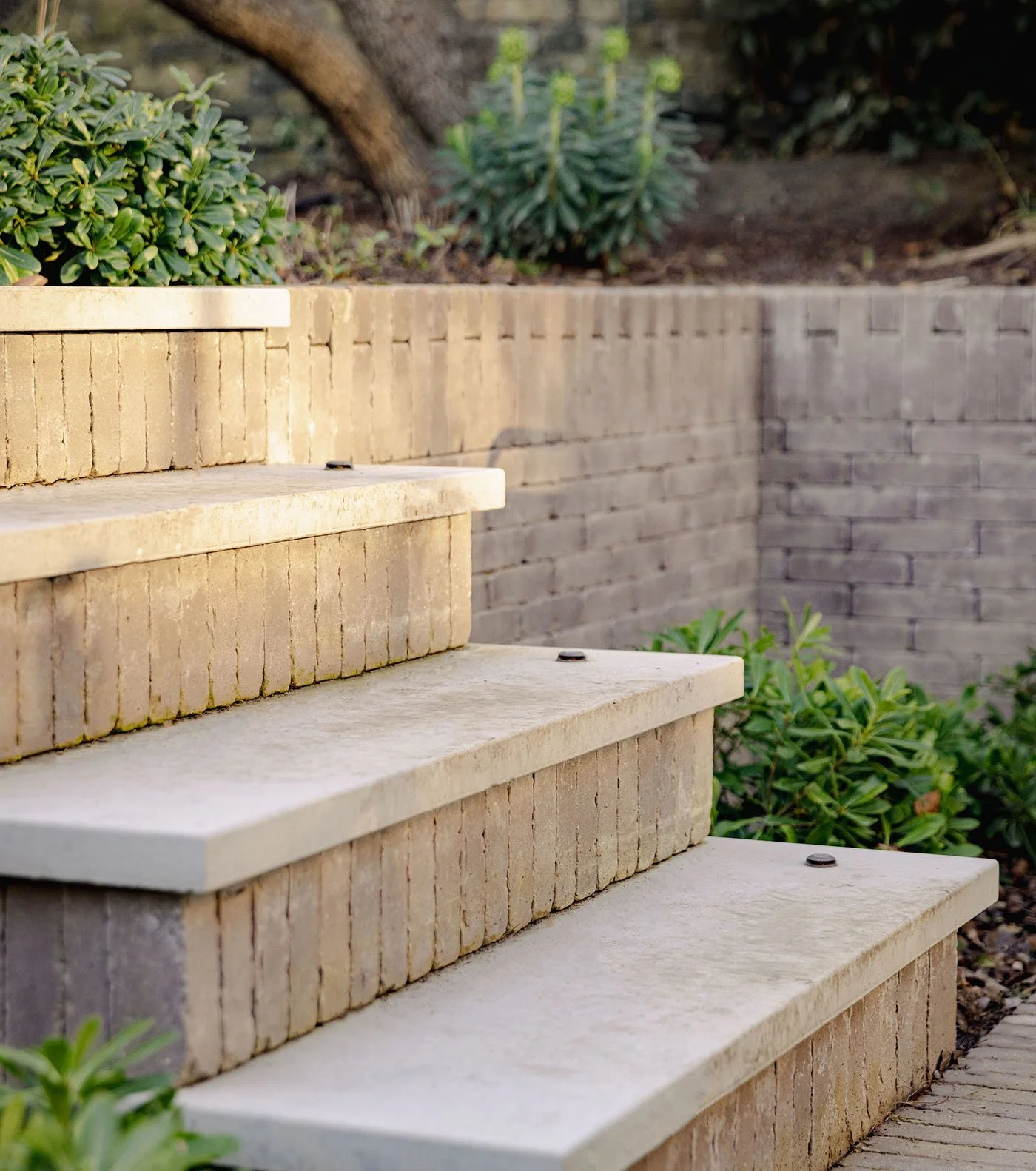 Close-up of high-quality stone steps with brickwork edging and surrounding greenery in a landscaped garden in London.